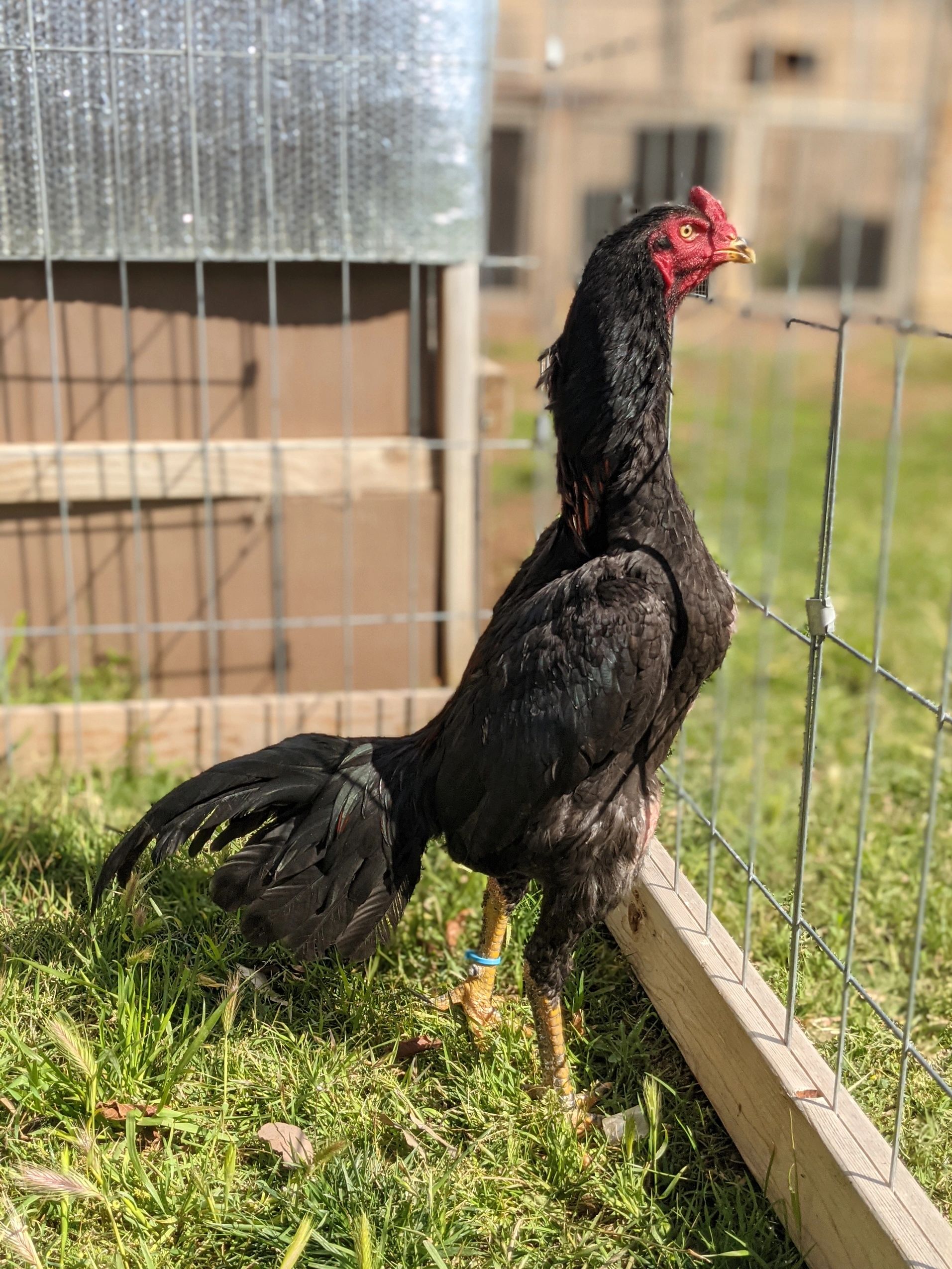 They feature a triple pea or walnut comb, strong broad back, the wing joints clearly pointing up giving Shamos their upright stance. The shanks are yellow or yellow with black spots.